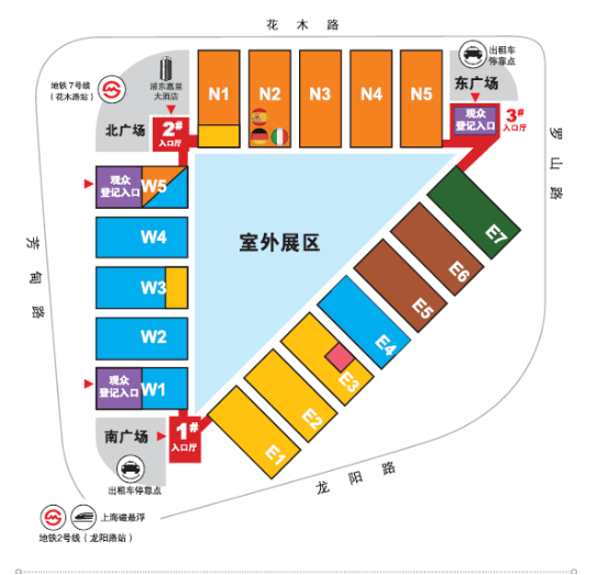 地鐵2號線,至龍陽路站下,步行10分鐘至展館1號(南)入口大廳或W1館觀眾入口 地推7號線,至花木路站下,步行1分鐘至展館2號(北)入口大廳或W5館觀眾入口